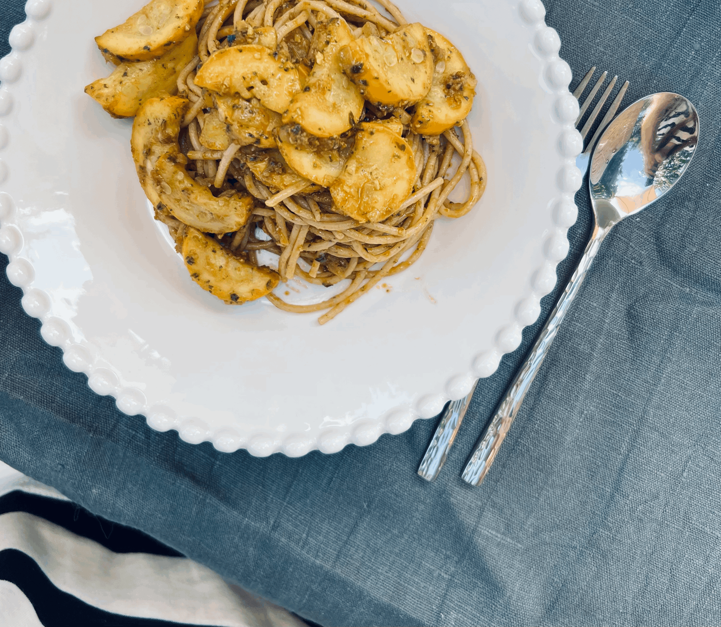 Volkoren spaghetti met pesto en gele courgette