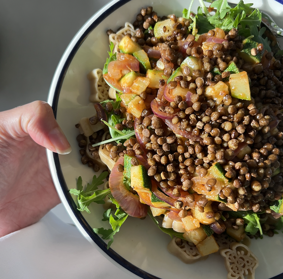 Voedzame pasta met krokante linzen